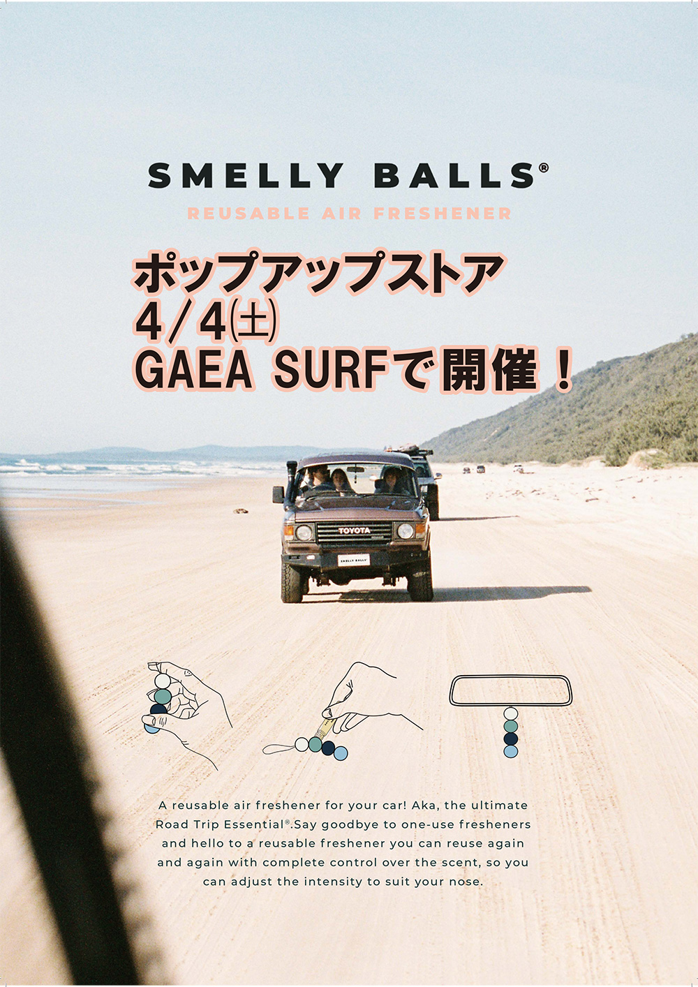 SHOP NEWS SMELLY BALLS REUSABLE AIR FRESHENER ポップアップストア 4月4日(土)GAEA SURFで開催! 2026年3月31日 GAEA Facebook post