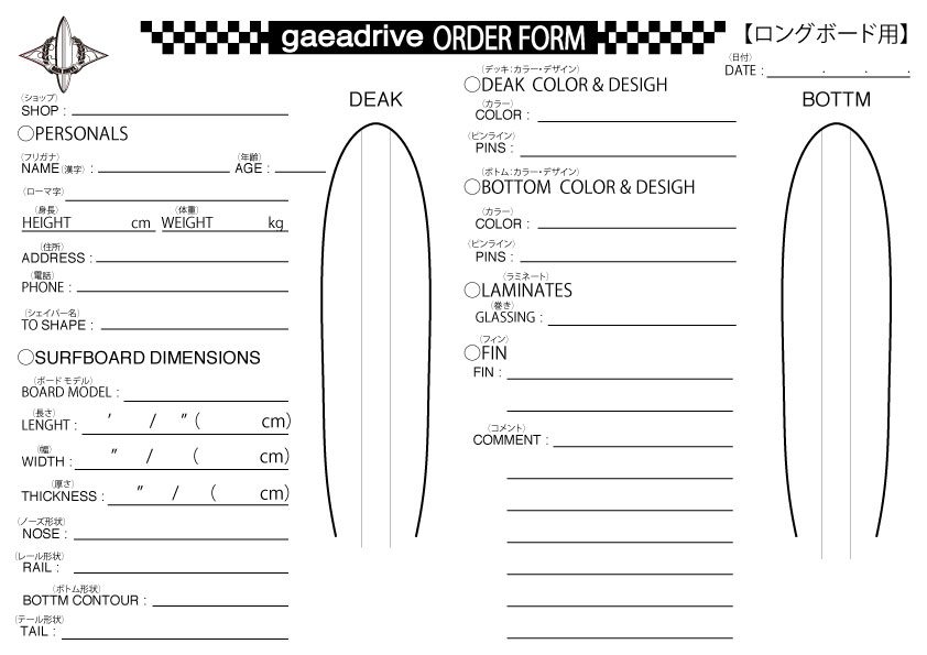 オーダーまでの流れ ① 30日間~60日間 DEMO・TEST期間 このTestで数種類のデモボードをしっかり時間をかけて様々な海のコンディションでテストして頂き、リサーチする。 ② ヒヤリング テストした時の話を聞き、カルテを作成する。 ③ オーダー用紙作成 カラー・モデル・サイズはもちろん、フォームとラミネート加工を選択する。 DECAL | ディケール ORDER FORM | オーダーフォーム